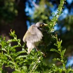 Back in the CBD I stopped by the City Botanic Gardens. Walking along the path I heard loud chirping. On investigation, I found a Noisy Miner chick! Being noisy, indeed. It hadn’t quite got the hang of flying yet and kept choosing twigs for which it was too heavy. I photographed it for a while, until Mummy turned up. Who wasn’t at all pleased with me and my camera, and thus proceeded to fight me off with energetic scratches and flapping wings. I got the message and took the final shot of her feeding her chick from further away.